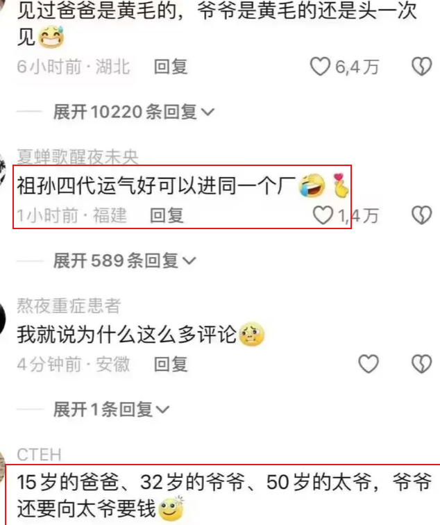 一家四代人的年龄差距足以刷新三观,评论区有网友调侃:祖孙四代人运气好的话,可以进同一个厂子打工!算一算还真是,如果运气好的话,重孙子进厂的时候,太爷爷没准还没退休呢。